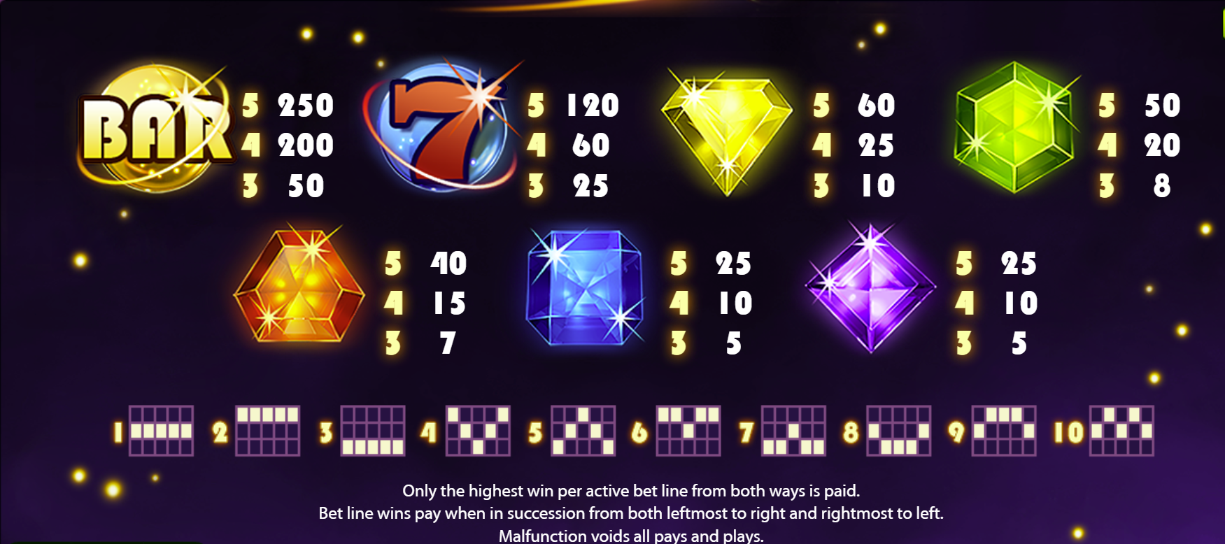 Starburst uses a simple 5-reel, 3-row layout with 10 fixed paylines. Wins are formed by landing matching symbols on adjacent reels from either left to right OR right to left (Both Ways), effectively doubling your chances on every spin. The gameplay is fast-paced, with wins triggering satisfying gem-crushing animations.